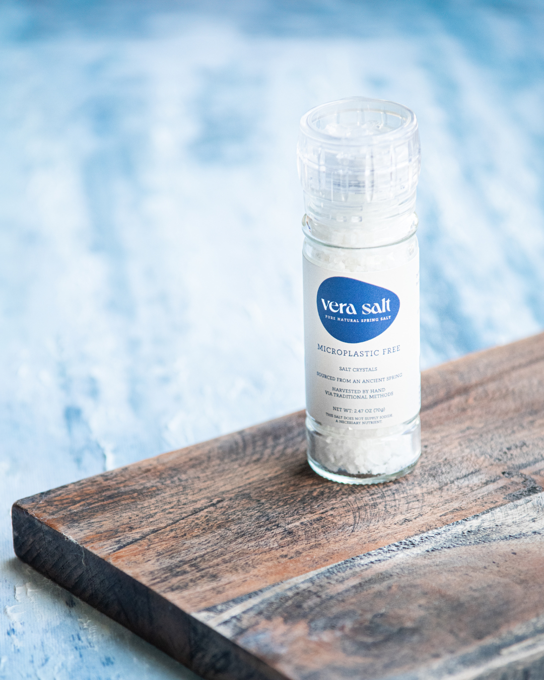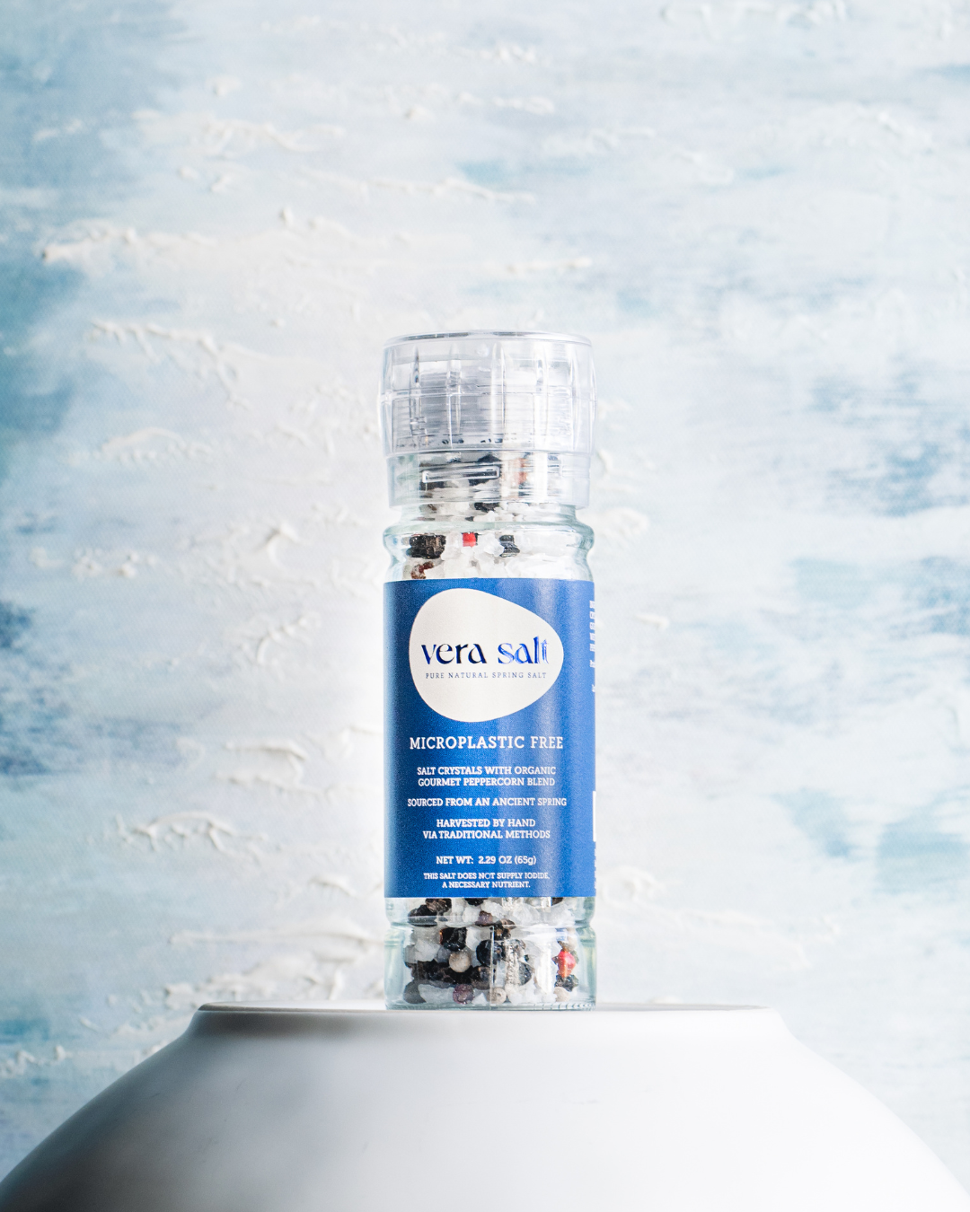The Vera Spring Salt Grinder is filled with our high-purity white salt crystals, perfect for both general cooking and seasoning. It serves as a wonderful tableside accompaniment for everyday use.